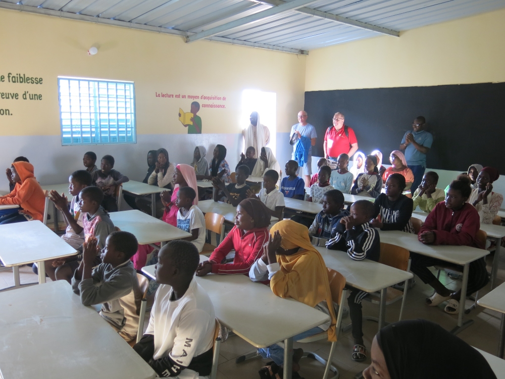 Die glücklichen Schüler in ihren neuen Klassenräumen. Auch diese wurden wieder mit der in Lüdinghausen ausgemusterten Bestuhlung ausgestattet, die im Container in den Senegal verschifft wurde. (Feb. 2025)